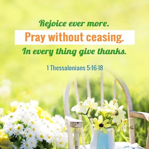 "Rejoice ever more. Pray without ceasing. In every thing give thanks: for this is the will of God in Christ Jesus concerning you. " 1 Thessalonians 5:16-18